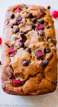 Super-moist and incredibly indulgent brown sugar banana bread loaded with dark chocolate chips and raspberries.