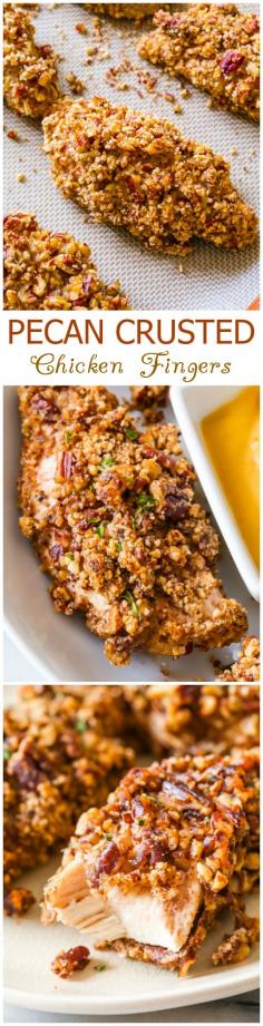 Pecan Crusted Chicken Fingers-- baked, not fried! Crunchy, nutty, toasty, delicious!