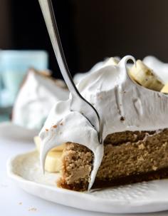 peanut butter cheesecake with whipped marshmallow and bananas