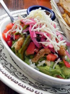 "Loaded" Guacamole with chicharrones, tomato, pickled onion, pomegranate seeds, queso cotija, rajas, pepitas and bacon from Del Fuego Taqueria