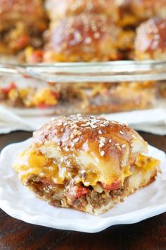 These Cheesy Party Burgers are so fun! Great to serve to a crowd or just to make dinner fun. Perfect for parties because you can make them the night before and cook the next day. If you want to start the party, make these Cheesy Party Burgers!!
