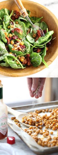 Spicy Roasted Chickpeas flavor this healthy salad with crunch and bacon on foodiecrush.com