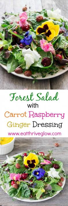 Easy salad recipe with a delicious carrot raspberry ginger dressing. Simple and healthy! Has hazelnuts, thyme, cherries, and berries.