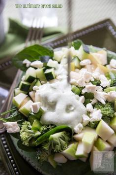 The Ultimate Green Salad // Ever thought of celebrating St. Patrick's Day and not sure what to eat that's nutritious and free of artificial food coloring? This would be an excellent GREEN meal (or starter) to serve to your family! All delicious fruits and vegetable served atop fresh spinach & drizzled with tasty tomatillo dressing. YUM! // Tried and Tasty