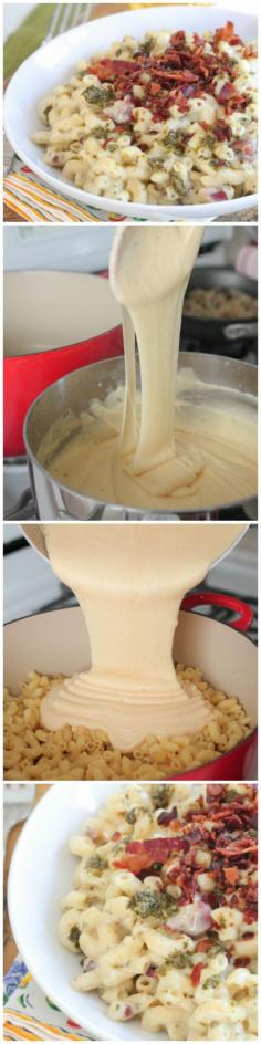 Bacon Pesto Mac and Cheese--made this with the mac n cheese recipe on this board and then added the bacon and pesto & cooked up chicken and onions and mixed it all together. YUM.
