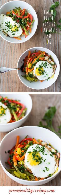 A recipe for Garlic Butter Roasted Vegetables and Egg containing sugar snap peas, bell pepper, carrots, leek and loads of butter and garlic