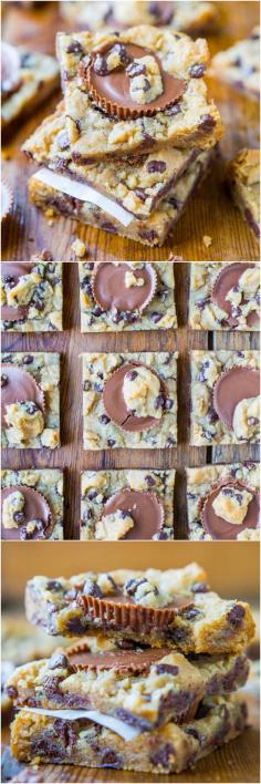 Two-Ingredient Peanut Butter Cup Chocolate Chip Cookie Dough Bars Recipe (GF) - The easiest bars ever and no one will ever guess it! So good!