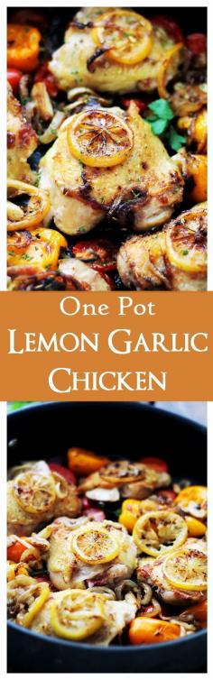 One Pot Lemon-Garlic Chicken and Veggies | www.diethood.com | Tender, garlicky, seared chicken thighs baked with sweet peppers, onions and tomatoes.