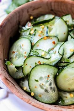Cilantro Lime Cucumber Salad / thefoodcharlatan Yield: 5-6 side servings Ingredients 1 jalapeno, seeded and finely diced 2 cloves garlic, finely minced 3 tablespoons fresh lime juice 1/4 teaspoon crushed red pepper ½ teaspoon salt, or to taste black pepper to taste 3 tablespoons olive oil 2 cucumbers, very finely sliced (see photos) 4 tablespoons minced cilantro, to taste Instructions Dice the jalapeno and garlic and add to a medium-sized bowl. Add 3 tablespoons of fresh lime juice, crushed red pepper, salt, and pepper. Use a whisk to incorporate the 3 tablespoons olive oil. Set aside. Finely slice the cucumbers. Use a mandolin if you have it, but a very sharp knife will do the trick. (See photos below.) Add the cucumbers to the dressing and stir together. Finely mince the cilantro and add it to the bowl. Stir to combine. You can either let it sit in the fridge to marinate for a couple hours, or serve immediately. Notes Make sure that you let the salad sit on the counter for a little while before serving if it's been in the fridge; the olive oil solidifies slightly when it's cold.