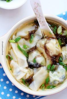 Ingredients 1/2 cup of dried wood ear mushroom (soaked in clean water around 10 minutes firstly) 1 small size broccoli 1/4 box of fresh tofu 2 teaspoons salt 2 teaspoon sesame oil 4. OZ wonton wrappers (click here to make wonton wrappers at home) 3 cups of water One small piece of Dried nori Seasonings for each serving bowl 1 tablespoon chopped spring onions 1/2 teaspoon salt 2 teaspoons light soy sauce severl drops of sesame oil