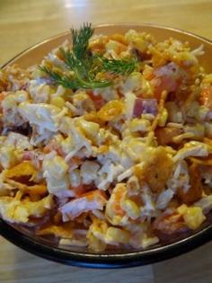 Paula Deen Frito and Corn Salad Recipe - Ingredients 2 (15 ounce) cans whole kernel corn, drained 2 cups grated cheddar cheese ( I used marble cheddar) 1 cup mayonnaise 1 cup green pepper, chopped (I used an orange bell pepper instead that I got for .25 on this week’s shopping trip) ½ cup red onion, chopped 1 (10½ ounce) bag coarsely crushed Fritos chili cheese corn chips