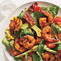 Shrimp Cobb Salad. Prepared this for a potluck with grilled shrimp, romaine, fresh corn, avocado, cherry tomatoes in a light balsamic vinaigrette - w/o the bacon. There was nothing left - yum.